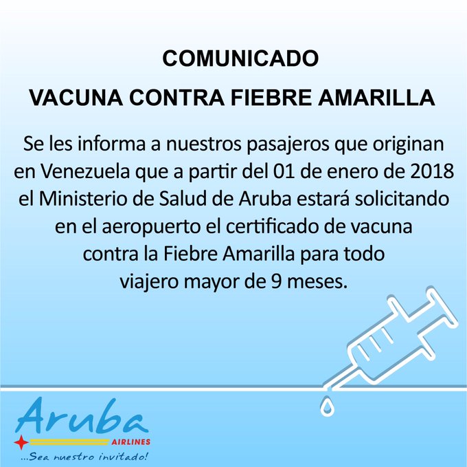 La aerolínea Aruba Airlines comunicó a sus usuarios a través de su cuenta en Twitter lo siguiente. “Se les informa a nuestros pasajeros que originan en Venezuela que a partir del 1 de enero de 2018, el Ministerio de Salud de Aruba estará solicitando en el aeropuerto el certificado de vacuna contra la fiebre amarilla para todo viajero mayor de 9 meses”.
