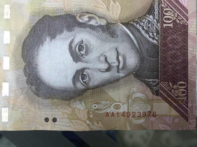 “Los billetes de 100 que tienen la denominación AA los venden en 140 bolívares el papel moneda es perfecto para falsificar el billete de 20$”, refirió García a través de su cuenta en Twitter.